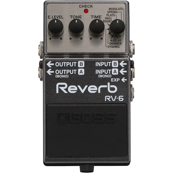 Combining high-end sound and wide-ranging versatility, the RV-6 takes pedal-based reverb to the next level. Reaching beyond the capabilities of previous generations, this powerful stomp employs the latest tech and legendary BOSS know-how to make it easy to get amazing reverb tones instantly. From subtle rooms to modern shimmer effects to long, evocative reverbs, the RV-6 envelops your tone in lush ambient spaces that endlessly inspire.