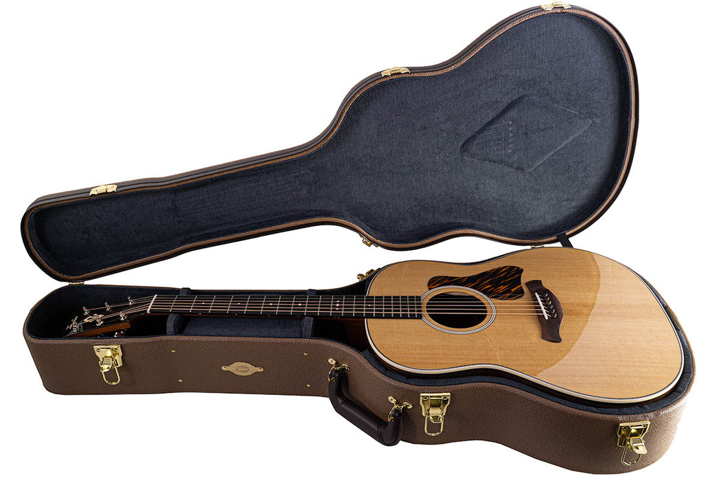 Appointments include a Curve Wing bridge in Honduran rosewood with matching bridge pins, cream-colored binding and a matching single-ring rosette, Crest inlays, our newly modified headstock shape, a firestripe pickguard, and a full-body gloss finish. It ships with LR Baggs Element VTC electronics and a deluxe hardshell case with a British Cocoa exterior.